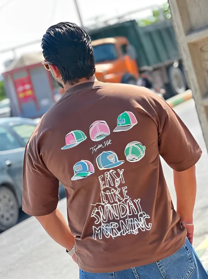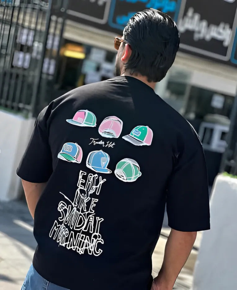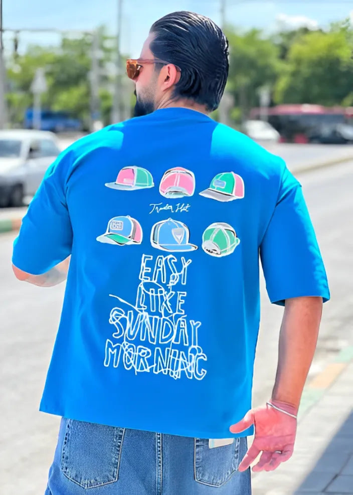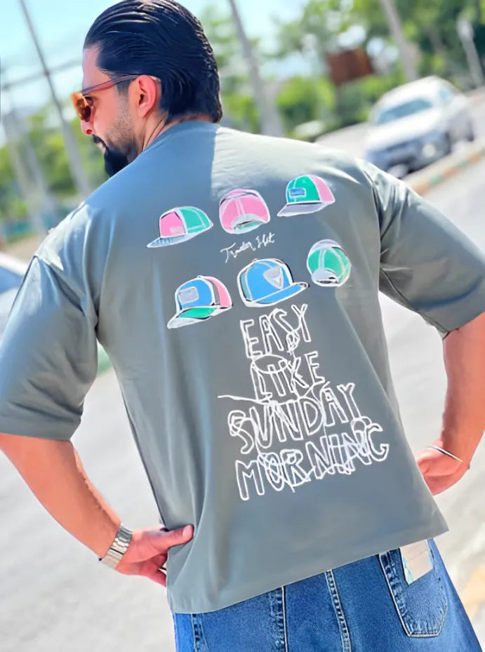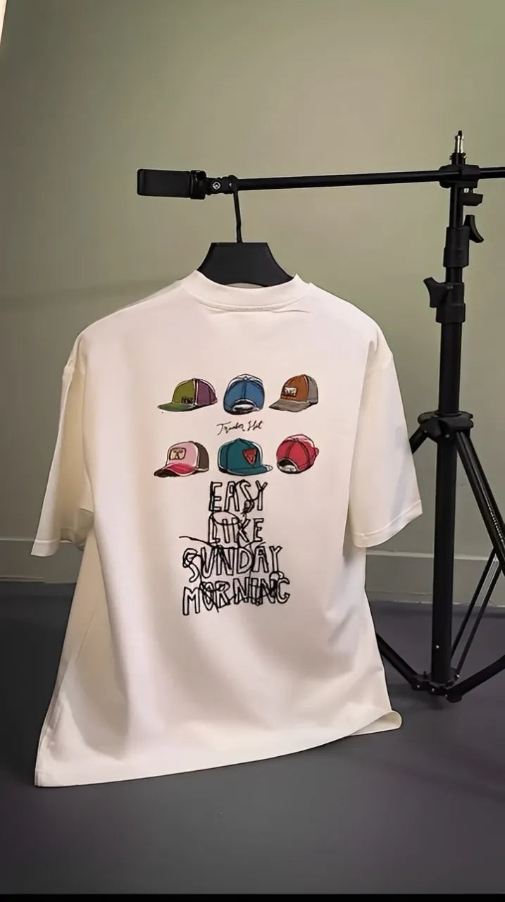 Take it easy in our "Easy Like Sunday Morning" oversized t-shirt – the perfect blend of laid-back attitude and fresh street style. Featuring a bold graphic of colorful trucker hats and a smooth hand-drawn typeface, this tee is all about chill energy and weekend feels.